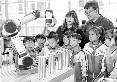 近日,河北省秦皇島市海港區(qū)交建里小學(xué)聯(lián)合燕山大學(xué)工程訓(xùn)練中心舉辦“學(xué)習(xí)科普知識 感受智能制造”活動,讓學(xué)生感受智能制造的魅力和科技發(fā)展成就,培養(yǎng)學(xué)生的科學(xué)精神。圖為工作人員為學(xué)生介紹智能化打標(biāo)檢測與裝配系統(tǒng)。 曹建雄 攝