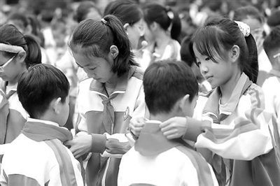 ①山東省高密市恒濤實驗小學(xué)少先隊老隊員為新隊員佩戴紅領(lǐng)巾。 通訊員 李海濤 攝