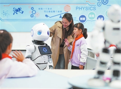 江蘇省泰州市姜堰區(qū)淮海小學(xué)學(xué)生與智能機(jī)器人互動(dòng)。周社根 攝