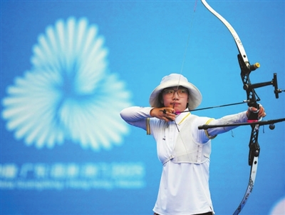 在射箭女子反曲弓個(gè)人決賽金牌決賽中,湖北小將宗鈺戰(zhàn)勝江蘇隊(duì)選手奪冠。