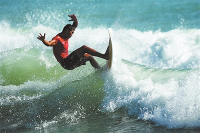 在沖浪男子短板決賽中,18歲的海南隊(duì)選手吳世棟戰(zhàn)勝對(duì)手奪冠。