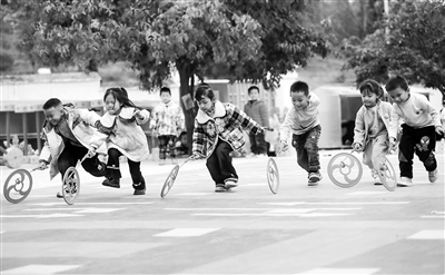 孩子們在進(jìn)行滾鐵環(huán)比賽。