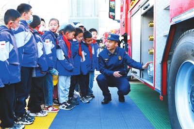 近日,消防隊(duì)員在給該校學(xué)生講解消防安全知識。