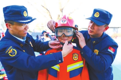 近日,該校學(xué)生在體驗(yàn)消防裝備。 岑屹 攝