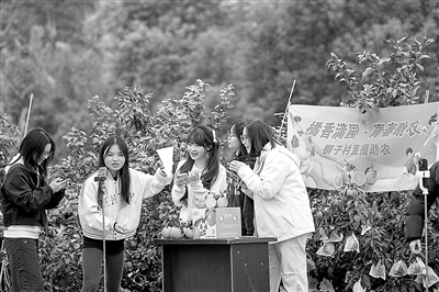 在四川眉山天府新區(qū)青龍街道獅子村,四川大學(xué)錦江學(xué)院的學(xué)生正在通過(guò)直播推銷(xiāo)柑橘。翁光建 攝