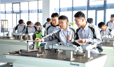 在歌爾匠造中心機(jī)械裝調(diào)理實一體化教室里,學(xué)生在學(xué)習(xí)典型機(jī)械結(jié)構(gòu)裝配調(diào)試。資料圖片