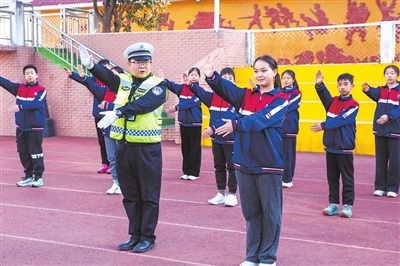 11月28日,湖北省襄陽市諸葛亮中學,民警正在教學生們交通安全手勢。 李旭暉 攝