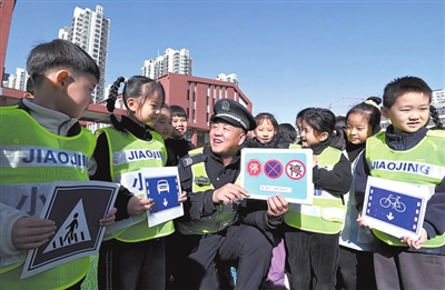 11月27日,河北省邯鄲市交巡警支隊民警教邯山區(qū)渚河路第二小學學生識別交通標志。 郝群英 攝