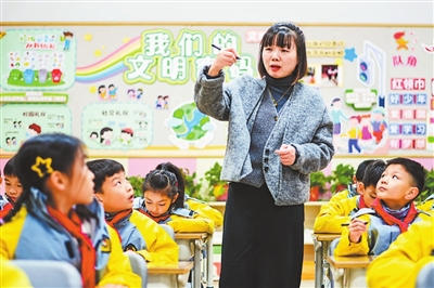 12月3日,杭州市長壽橋岳帥小學(xué)教師在課堂上教導(dǎo)學(xué)生們?nèi)绾问褂弥悄芄P答題。