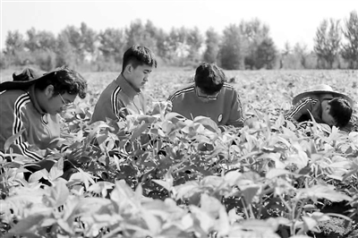 長(zhǎng)春職業(yè)技術(shù)大學(xué)現(xiàn)代農(nóng)業(yè)專業(yè)學(xué)生在中科院地理所大豆實(shí)驗(yàn)田實(shí)習(xí)人工授粉。
