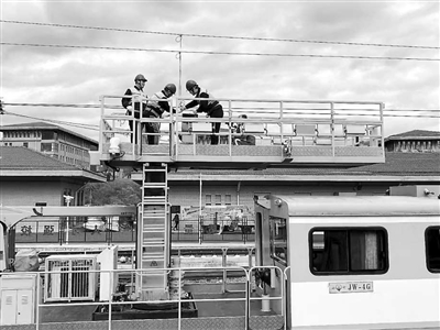 吉林鐵道職業(yè)技術(shù)大學(xué)鐵道供電技術(shù)專業(yè)學(xué)生在接觸網(wǎng)檢修作業(yè)車的檢修平臺(tái)上進(jìn)行更換整體吊弦作業(yè)。