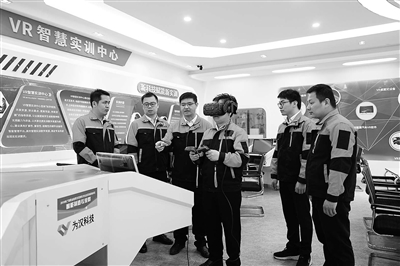 廣西現(xiàn)代職院智能制造技術(shù)教學(xué)團(tuán)隊(duì)在VR智慧實(shí)訓(xùn)中心現(xiàn)場教學(xué)。學(xué)校供圖