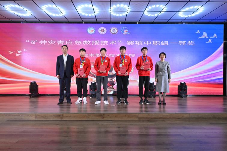 王慧凌、袁愛清為礦井災(zāi)害應(yīng)急救援技術(shù)賽項(xiàng)(中職組)一等獎(jiǎng)獲得者頒獎(jiǎng)