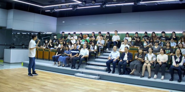 余亞飛以《1921》《鐵道游擊隊(duì)》《英雄兒女》《永不消逝的電波》等經(jīng)典電影作品中的紅色音樂,通過導(dǎo)賞的方式,結(jié)合嘉賓的現(xiàn)場演繹,生動(dòng)講解了以偉大建黨精神為源頭的中國共產(chǎn)黨人精神譜系。助唱嘉賓與現(xiàn)場師生共同高唱《我和我的祖國》將黨課推向高潮,師生們在聽覺和視覺雙重盛宴中重溫紅色經(jīng)典,回顧百年黨史,感悟偉大建黨精神,凝聚紅色力量。
