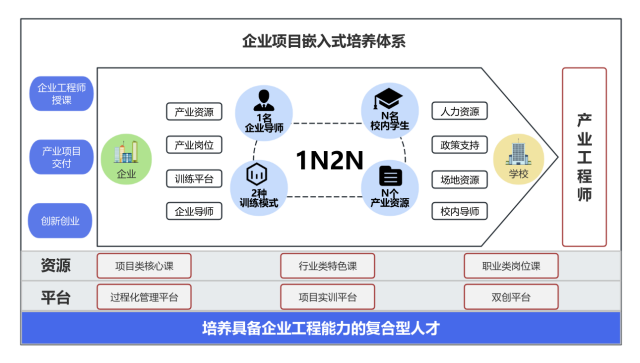 “1N2N”企業(yè)項(xiàng)目嵌入培養(yǎng)體系的核心在于以項(xiàng)目實(shí)戰(zhàn)為導(dǎo)向,以學(xué)徒制為核心,1名企業(yè)工程師帶多名學(xué)生,通過企業(yè)案例項(xiàng)目實(shí)踐和產(chǎn)業(yè)實(shí)際項(xiàng)目交付訓(xùn)練兩種模式,循序漸進(jìn)、分層賦能,通過多個(gè)產(chǎn)業(yè)項(xiàng)目交付,實(shí)現(xiàn)從學(xué)生到產(chǎn)業(yè)工程師的快速轉(zhuǎn)身,打造學(xué)生“畢業(yè)即就業(yè)”的能力。