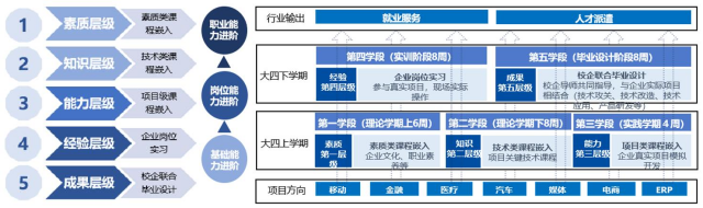 桂林學(xué)院秉承OBE教學(xué)理念,堅(jiān)持立德樹人根本任務(wù),通過“產(chǎn)教融合、校企協(xié)同、工學(xué)并重”策略,依托東軟軟件學(xué)院共建產(chǎn)教融合基地。此合作項(xiàng)目精耕技術(shù)技能型人才培育,強(qiáng)調(diào)崗位引導(dǎo)與項(xiàng)目驅(qū)動(dòng)的理論實(shí)踐一體化教學(xué)方法,采取“2.5+1.5”的培養(yǎng)模式,并融入線上線下的混合式教學(xué)新范式。學(xué)校推行O2O混合教學(xué)模式,變革課程體系與教學(xué)方法,實(shí)行校企雙導(dǎo)師制度,為學(xué)生提供全方位成長(zhǎng)指導(dǎo)。通過深化校企、校地及校際合作,學(xué)校打造了以“一個(gè)核心、四個(gè)階段、五個(gè)層級(jí)”為框架的應(yīng)用型軟件人才培養(yǎng)體系,旨在構(gòu)建一個(gè)協(xié)同育人的示范高地。
