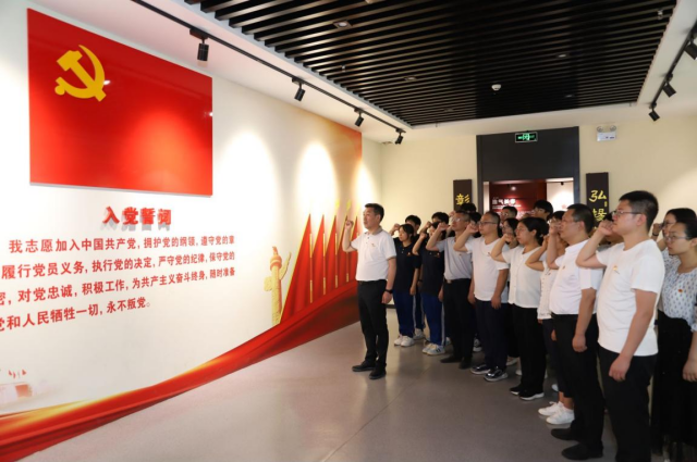 在紀(jì)念館大廳內(nèi),全體黨員面向黨旗,莊重地重溫了入黨誓詞。