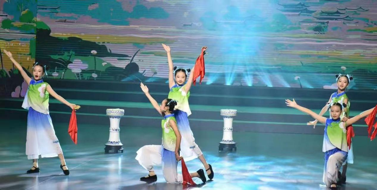 8月3日晚,江西景德鎮(zhèn)市浮梁縣第一小學的5名學生登上舞臺。她們說著流暢而又風趣的景德鎮(zhèn)方言,敲擊著色澤雅麗、清麗脫俗的景德鎮(zhèn)青花瓷大鼓,搭配著獨特的唱腔和優(yōu)美的舞蹈,贏得了專家評委的好評和現(xiàn)場觀眾熱烈的掌聲。參與《能干娃》演出的5名小演員是從該校500多名學生中選拔出來的。2023年3月到7月,她們開始了長達4個多月的訓練,從學習景德鎮(zhèn)方言,到練習鼓點技法,再到學習唱腔和表演,節(jié)目質量逐步得到提升。