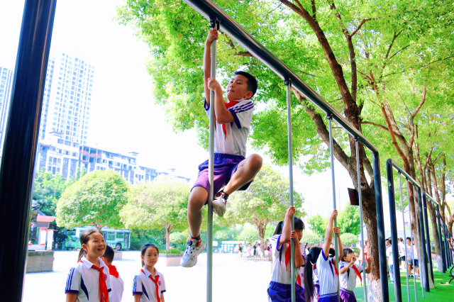 為優(yōu)化課間活動,興龍湖小學(xué)除了開展豐富多彩的體育活動、游戲活動以外,還加大了對體育場地、設(shè)施器材的投入,增設(shè)了攀爬公園、蹦床公園和滑梯公園,并與現(xiàn)有的籃球公園、足球公園和民間游戲公園等活動場地相結(jié)合,形成了六大“體育公園”。學(xué)校還科學(xué)設(shè)置課間體育鍛煉任務(wù)群,引導(dǎo)6個年級分批循環(huán)使用,使校園形成了“處處是設(shè)施、時時可鍛煉、人人能參與”的“課間樂動圈”。
