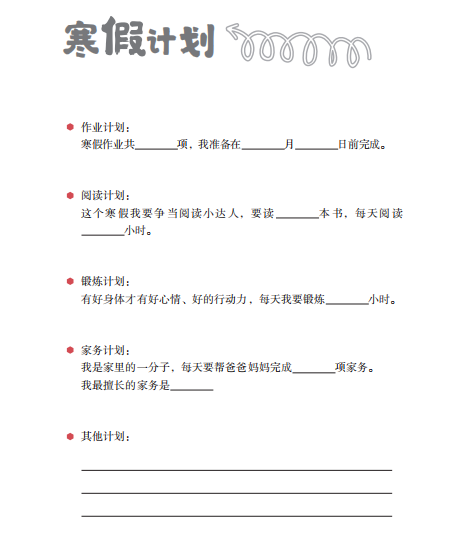 寒假計(jì)劃表:寒假讓孩子自己定一個小目標(biāo),作業(yè)、閱讀、家務(wù)、鍛煉……樹立目標(biāo),才能在假期結(jié)束的時候檢驗(yàn)成果,讓假期時光可追溯。