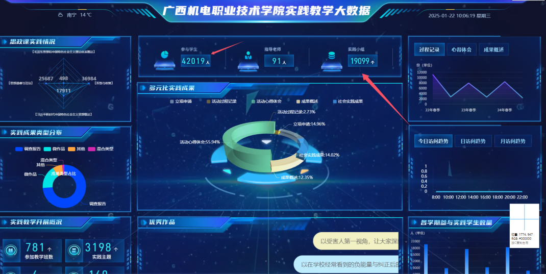 思政課實踐教學(xué)是高校實踐育人的重要環(huán)節(jié),但長期以來存在“組織難”“管理難”等頑疾,育人效果不夠明顯,迫切需要運用數(shù)字技術(shù)破解這一難題。2022年,當(dāng)時的新冠疫情對高校教學(xué)工作特別是實踐教學(xué)帶來了較大沖擊,學(xué)校積極主動應(yīng)對挑戰(zhàn),適時上線推出了廣西高校首個思政課綜合實踐教學(xué)平臺,實現(xiàn)實踐教學(xué)任務(wù)發(fā)布、項目立項、成果提交、評價反饋的全流程線上化和智慧管理。