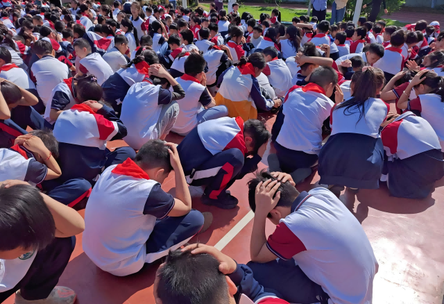 演練當(dāng)日上午9時(shí),隨著校園內(nèi)第一次警報(bào)(避險(xiǎn)信號(hào))驟然響起,各班學(xué)生迅速做出反應(yīng),按照教師教導(dǎo)的方法迅速下蹲,敏捷地躲到課桌下方,并用書(shū)本或雙手緊緊護(hù)住頭部,以避免在地震初期受到可能的傷害。大約1分鐘后,第二次警報(bào)(疏散信號(hào))劃破校園的上空,學(xué)生在教師指引下彎腰低身,按照預(yù)定好的疏散路線,快速且有序地撤離教室,向著操場(chǎng)空曠地帶奔去。