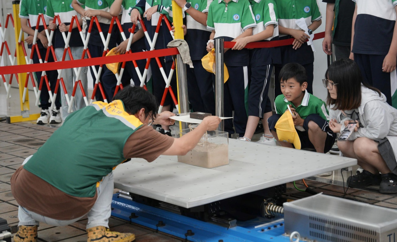 小學(xué)生現(xiàn)場感受振動臺模擬的地震對框架結(jié)構(gòu)的破壞力