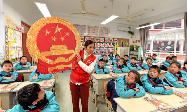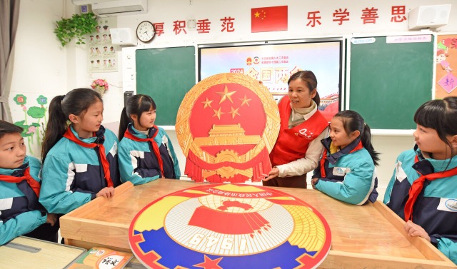 3月4日,浙江省臺(tái)州市仙居縣第一小學(xué)黨員老師向?qū)W生宣講兩會(huì)知識(shí)。當(dāng)日,仙居縣第一小學(xué)開展“兩會(huì)知識(shí)進(jìn)課堂”主題教育活動(dòng),通過主題班會(huì)、趣味問答等形式,向?qū)W生普及兩會(huì)知識(shí),引導(dǎo)學(xué)生從小關(guān)心國家大事。(中國教育報(bào)-中國教育新聞網(wǎng) 通訊員 王華斌 攝)