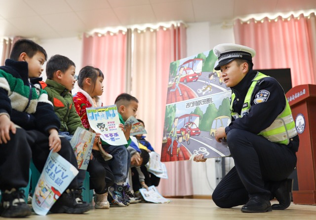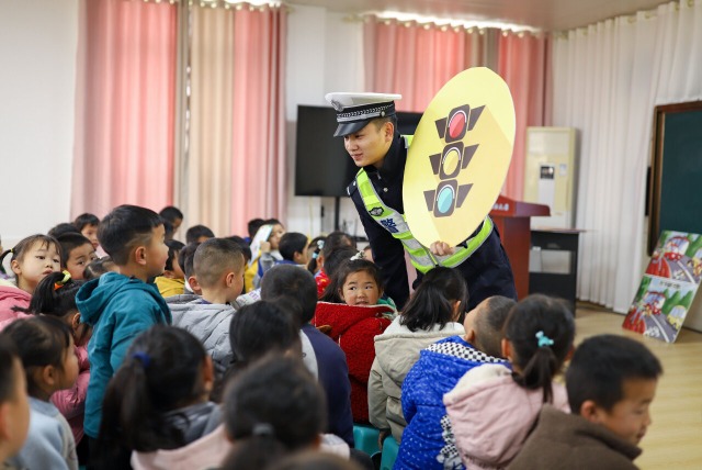 3月11日,貴州省黔東南苗族侗族自治州丹寨縣公安局交通警察大隊宣傳民警走進轄區(qū)揚武鎮(zhèn)幼兒園開展交通安全宣傳活動,宣傳民警通過通俗易懂的語言,為小朋友們講解如何安全過馬路,如何安全乘車,并利用“紅燈停、綠燈行、黃燈亮了等一等”“斑馬線、生命線、過馬路前看一看”等內(nèi)容對孩子們開展宣傳教育,調(diào)動孩子們學習交通安全知識的積極性,為孩子們養(yǎng)成遵守道路交通法規(guī)的良好習慣打下基礎。中國教育報-中國教育新聞網(wǎng)通訊員 陸德華 攝