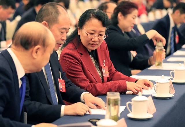 3月10日上午,山東省代表團(tuán)全體會(huì)議期間,全國(guó)人大代表、山東棗莊市第三中學(xué)教師孫曉穎(左三)與代表交流討論。