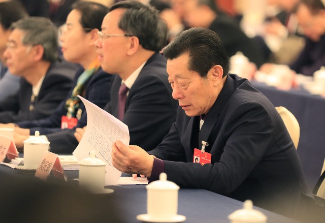 3月10日上午,山東省代表團(tuán)全體會(huì)議期間,全國(guó)人大代表,山東鄆城縣宋江武校校長(zhǎng)樊慶斌認(rèn)真閱讀會(huì)議材料。