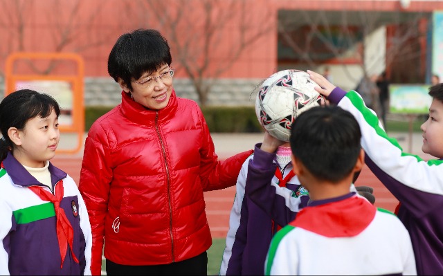 2023年2月21日,全國人大代表、山東省臨沂市北城小學(xué)黨總支張淑琴(左二)叮囑玩球的學(xué)生注意安全。