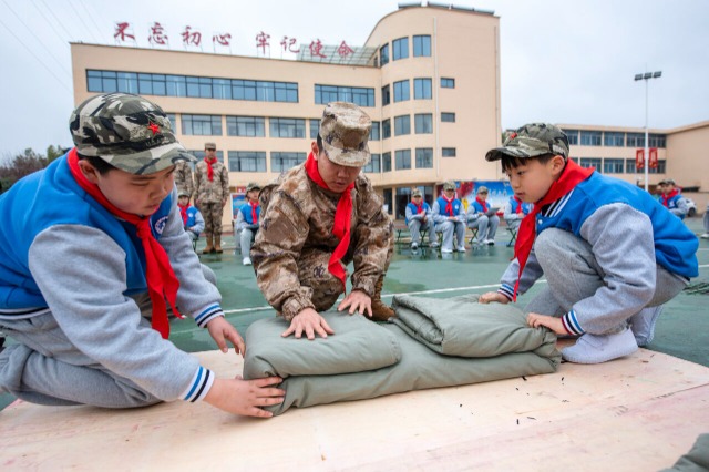 繁陽(yáng)鎮(zhèn)實(shí)驗(yàn)小學(xué)少先隊(duì)員在軍訓(xùn)教官的指導(dǎo)下體驗(yàn)疊軍被 通訊員 肖本祥 攝