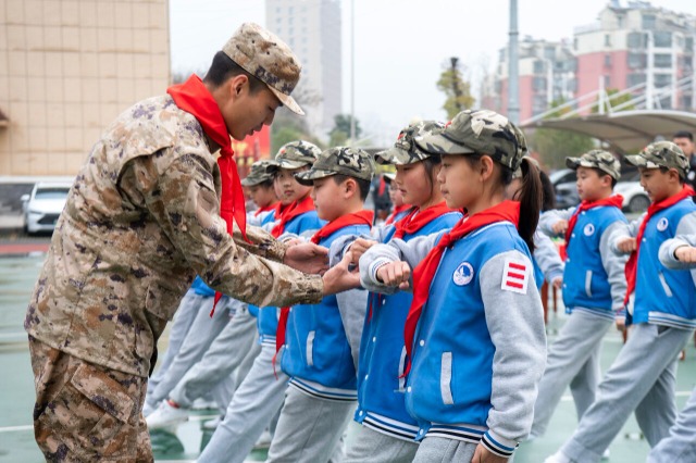 3月28日,安徽省蕪湖市繁昌區(qū)繁陽(yáng)鎮(zhèn)實(shí)驗(yàn)小學(xué)組織少先隊(duì)員走進(jìn)該區(qū)人武部,組織開(kāi)展“國(guó)防教育”主題少先隊(duì)活動(dòng)課。少先隊(duì)員們走進(jìn)軍營(yíng),通過(guò)實(shí)踐活動(dòng)、儀式教育、協(xié)同教育等多種形式,普及國(guó)防知識(shí),激發(fā)隊(duì)員愛(ài)軍、擁軍之情,引導(dǎo)他們從小崇尚軍人、心系國(guó)防,弘揚(yáng)愛(ài)國(guó)主義精神。中國(guó)教育報(bào)-中國(guó)教育新聞網(wǎng)通訊員 肖本祥 攝