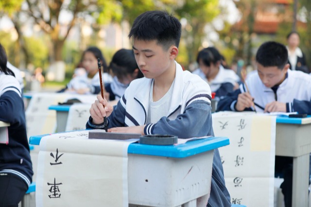 江西省吉安市第八中學(xué)學(xué)生在白鷺洲公園烈士紀(jì)念碑前書寫古詩 通訊員 李軍 攝