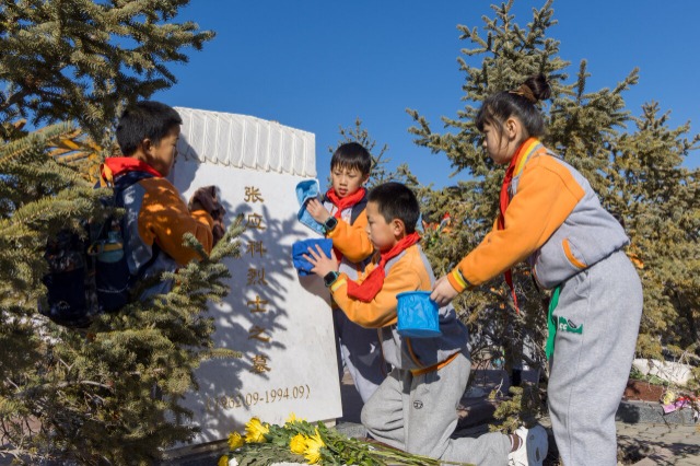 烏魯木齊市第73小學學生擦洗烈士墓碑 通訊員 孫振嵩 攝