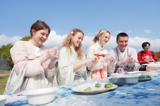 西南大學(xué)外國(guó)語學(xué)院的中外大學(xué)生體驗(yàn)做青團(tuán) 通訊員 秦廷富 攝