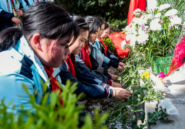 少先隊(duì)員敬獻(xiàn)花籃和鮮花,緬懷革命先烈。 歐宗濤 攝