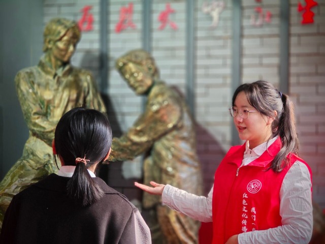 “在大廳中央的這尊雕塑名為‘江都英魂’,它的主體部分為大革命時(shí)期、抗日戰(zhàn)爭(zhēng)時(shí)期、解放戰(zhàn)爭(zhēng)時(shí)期三位革命先烈——?jiǎng)⒅孛?、江上青、許曉軒……”近日,在江都革命烈士陵園,又看見(jiàn)了這一群朝氣蓬勃的大學(xué)生們。他們身著紅馬甲,眼神中透露出堅(jiān)毅執(zhí)著,生動(dòng)講解著英烈們的故事。他們是一群來(lái)自揚(yáng)州大學(xué)紅色講解團(tuán)的義務(wù)講解員。至今,揚(yáng)州大學(xué)已有累計(jì)1萬(wàn)多名學(xué)子、7000多名學(xué)生黨員參與義務(wù)講解,累計(jì)服務(wù)社會(huì)大眾約290萬(wàn)人次?!罢啻骸钡膿P(yáng)大學(xué)子們,用點(diǎn)滴行動(dòng)詮釋著這抹靚麗的“志愿紅”,在一棒棒薪火傳遞中綻放青春精彩。(中國(guó)教育報(bào)-中國(guó)教育新聞網(wǎng) 通訊員 吳浩 王千尋 攝)