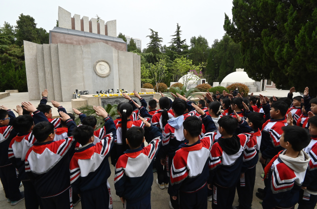 學(xué)生在晉冀魯豫烈士陵園為烈士默哀 郝群英 攝