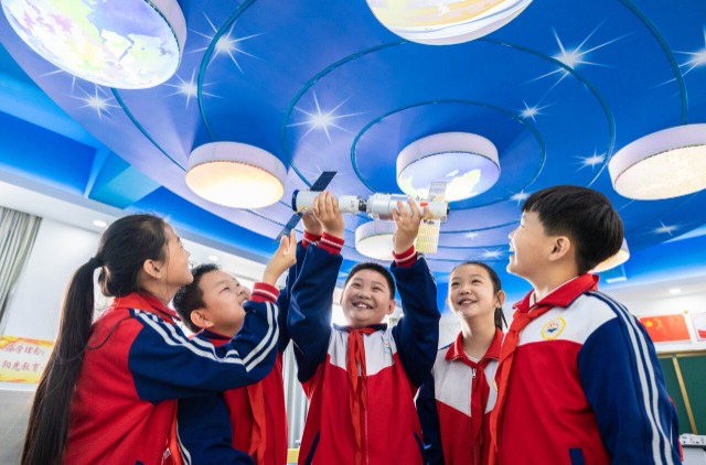 4月11日,內(nèi)蒙古呼和浩特市玉泉區(qū)石東路小學(xué)開(kāi)展“仰望星空 逐夢(mèng)航天”世界航天日主題科普活動(dòng),孩子們通過(guò)形式多樣的活動(dòng),學(xué)習(xí)航天科技知識(shí)、激發(fā)科學(xué)探索熱情。中國(guó)教育報(bào)-中國(guó)教育新聞網(wǎng)通訊員 丁根厚 攝