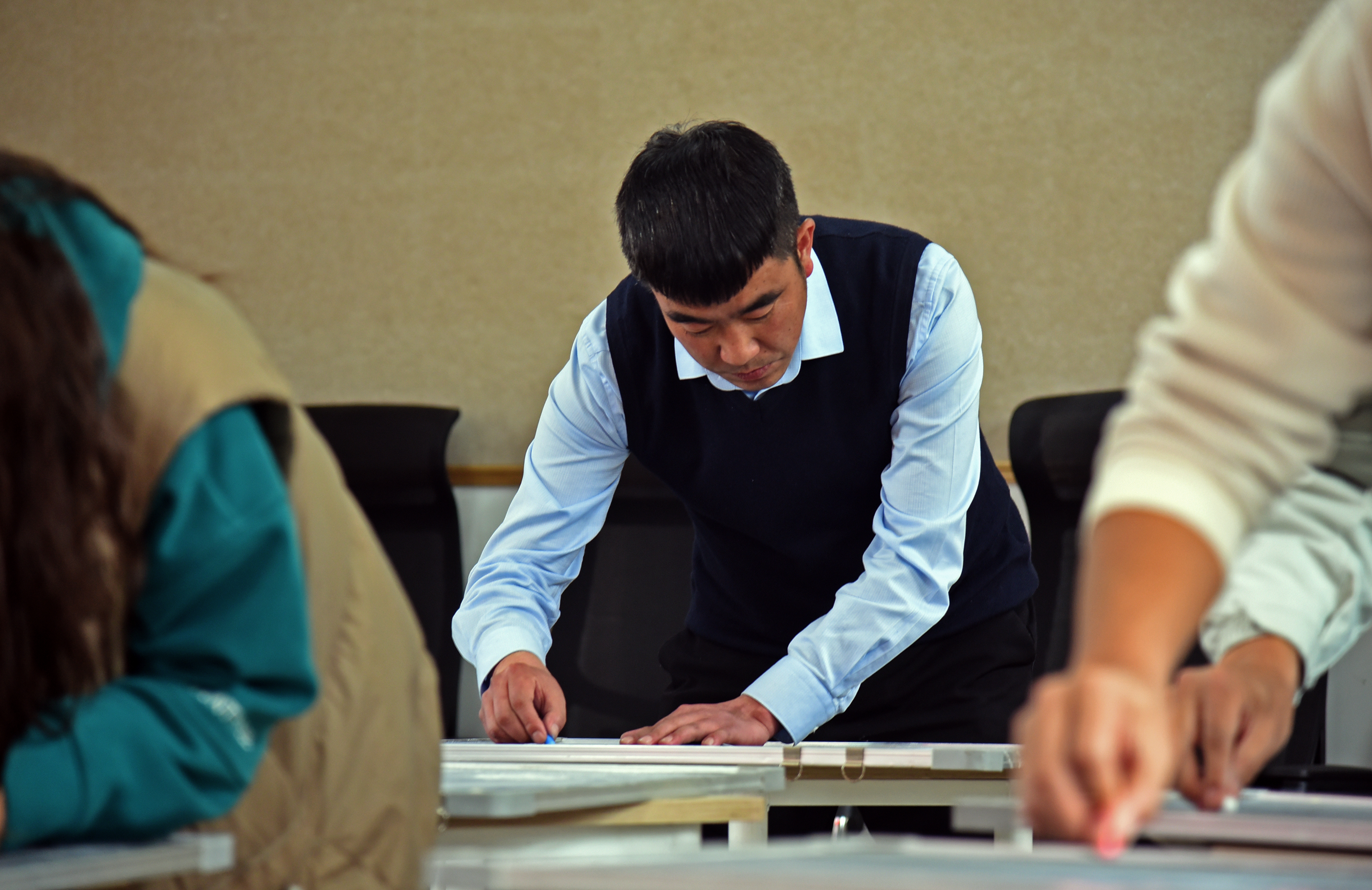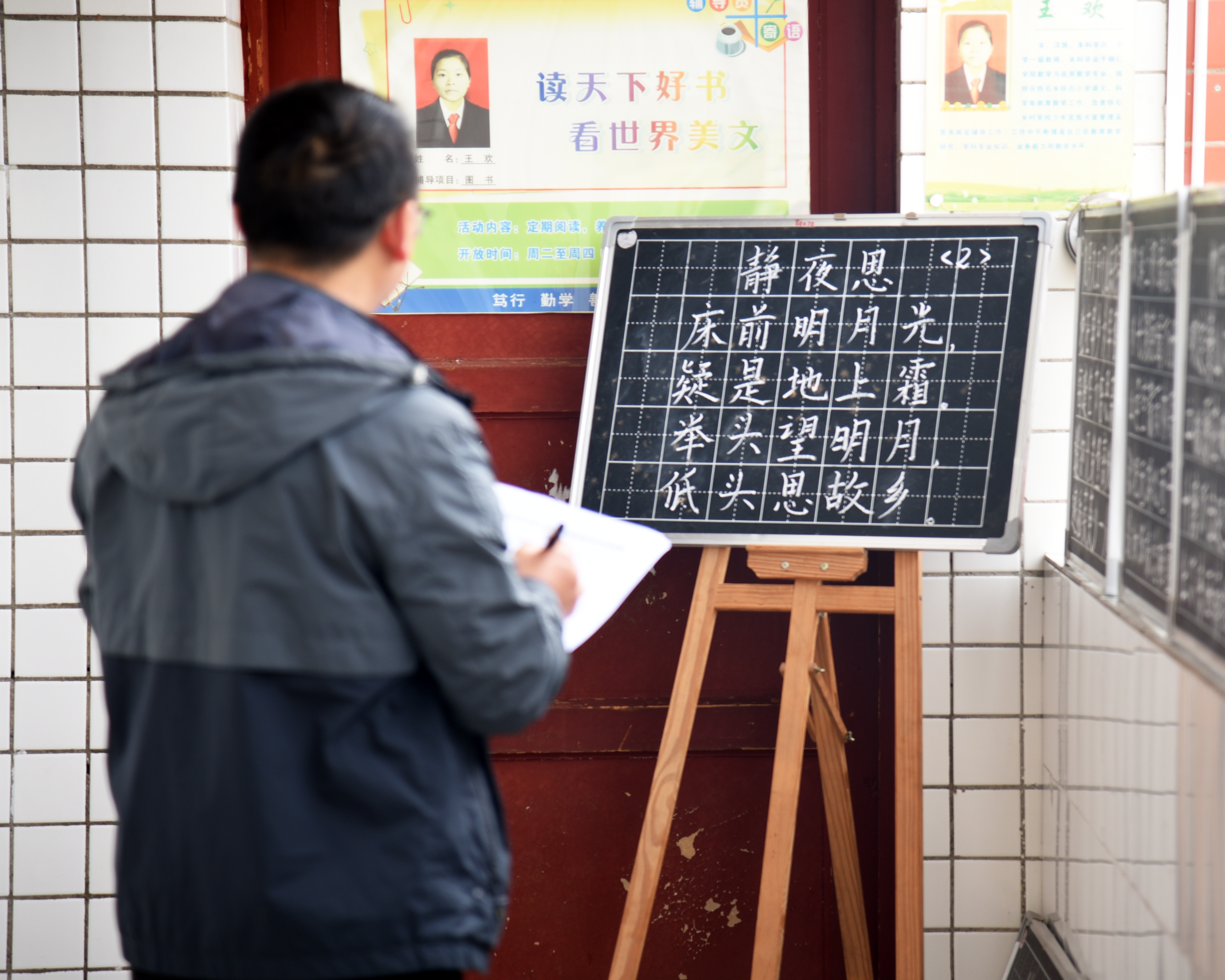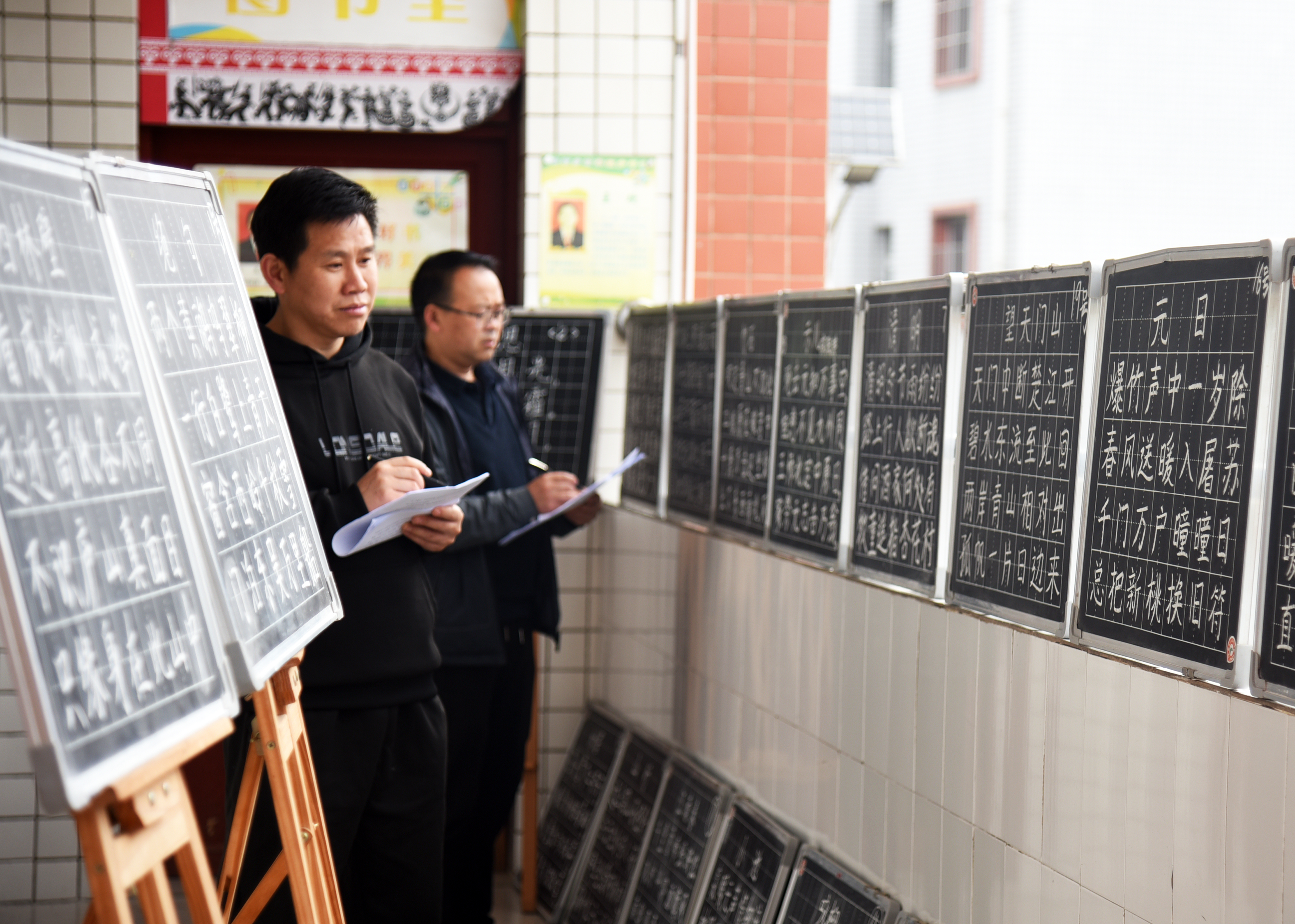 評委老師正為青年語文教師的粉筆字作品打分。熊軍萬 攝