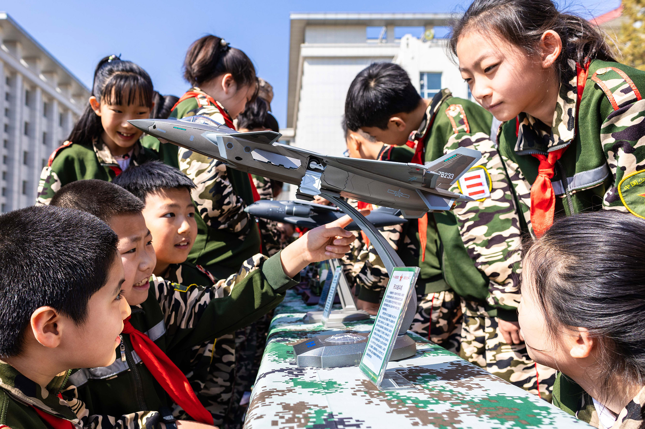 “少年軍?!睂W(xué)員在觀看展示的軍事裝備模型。通訊員 丁根厚 攝