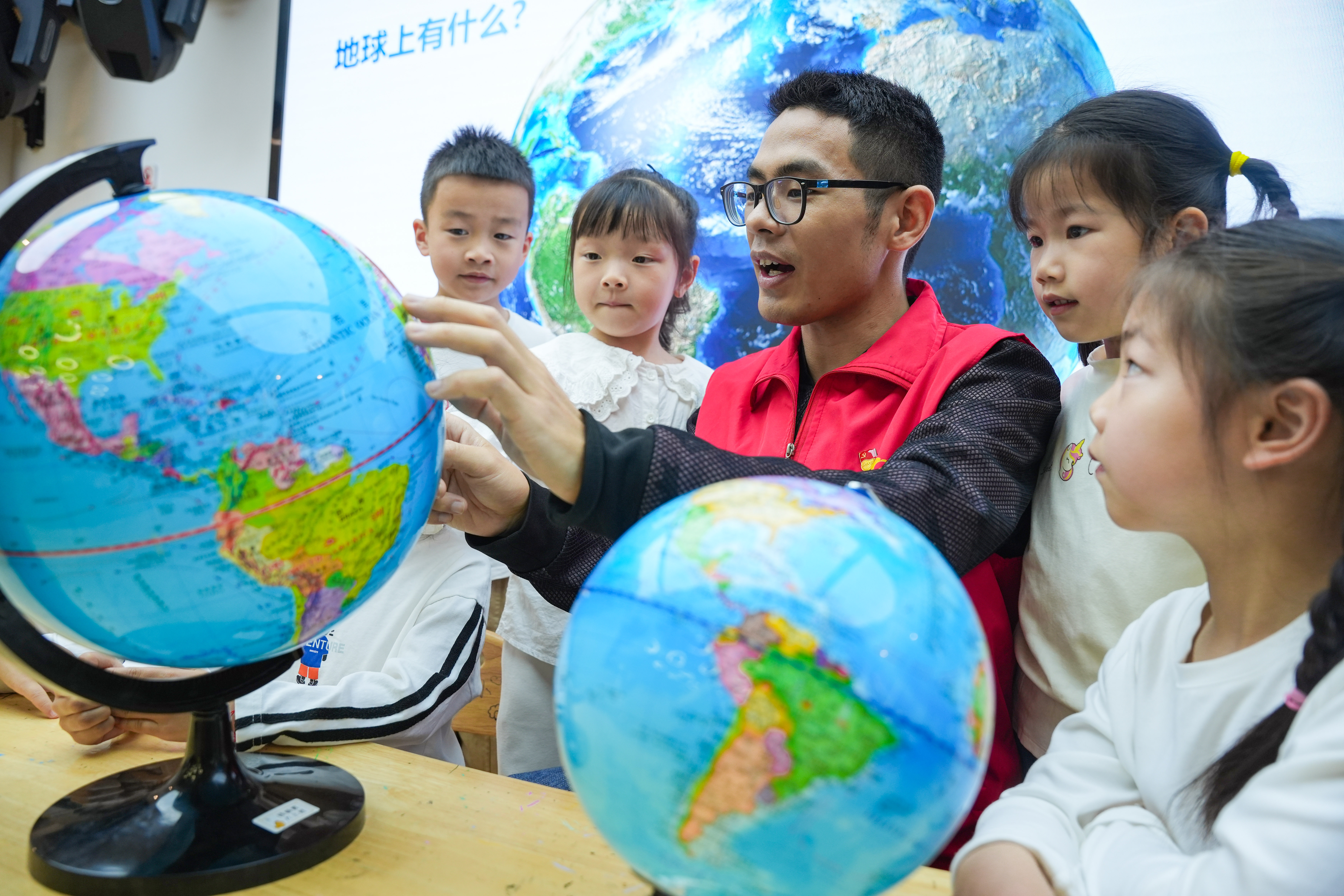 工作人員通過(guò)地球儀給孩子們講解地球科學(xué)知識(shí)。通訊員 陳海偉 攝