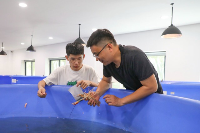 教師付寧(右)給學生講解龍蝦養(yǎng)殖專業(yè)知識。該校培育養(yǎng)殖的澳洲淡水龍蝦“東蝦西移”技術援疆項目,填補了沙漠龍蝦養(yǎng)殖的空白。中國教育報-中國教育新聞網記者 單藝偉 攝