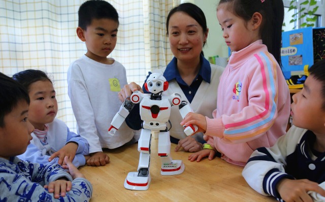編程后的機(jī)器人會(huì)唱歌、跳舞,深深吸引幼兒。中國(guó)教育報(bào)-中國(guó)教育新聞網(wǎng)記者 孫軍 攝