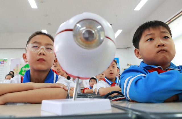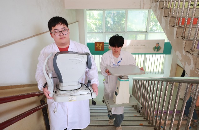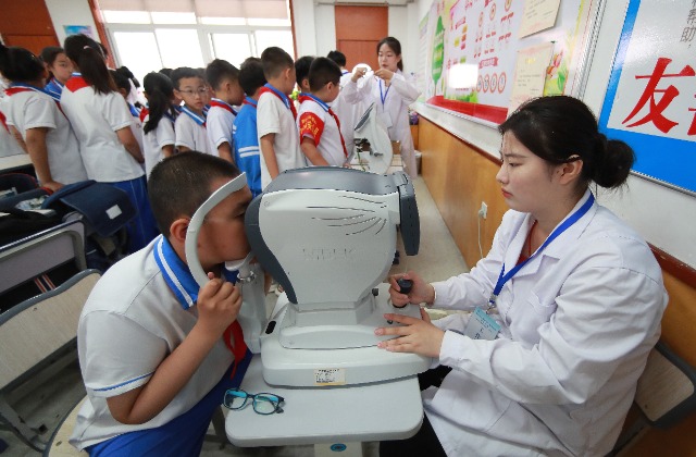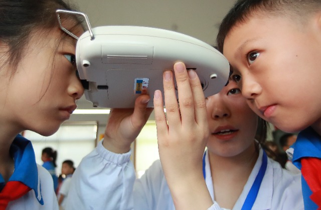 大學(xué)生志愿者用瞳距儀測量小學(xué)生雙眼瞳距。