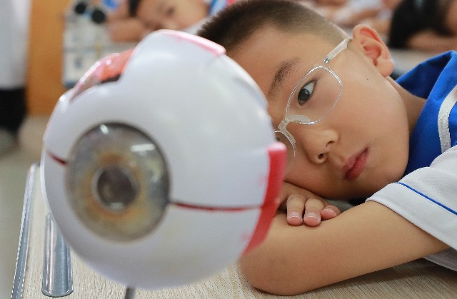 大學(xué)生志愿者在講解眼睛的結(jié)構(gòu)和功能。