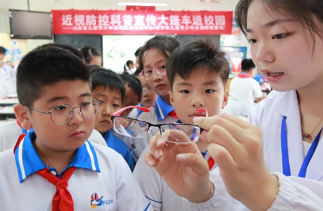 大學(xué)生志愿者在向小學(xué)生講解眼鏡的結(jié)構(gòu)和功能。