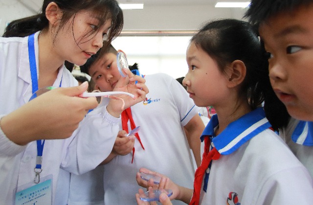 科普活動(dòng)現(xiàn)場,一名學(xué)生對(duì)眼睛模型發(fā)生興趣。